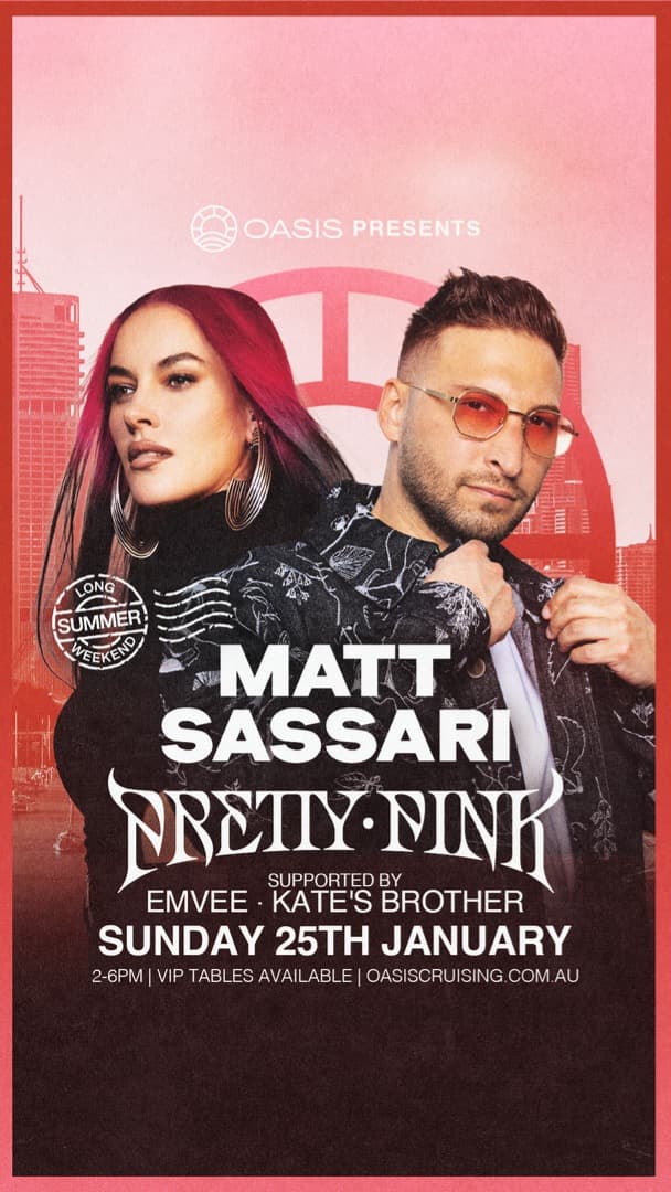 Join us this January Long Weekend at Oasis Brisbane for an unforgettable Sunday cruise featuring Matt Sassari and Pretty Pink. Get ready for cutting-edge house and techno as Matt Sassari brings his high-energy signature sound, while Pretty Pink delivers her melodic, feel-good grooves that have captivated dance floors worldwide. Set against the stunning backdrop of Oasis Brisbane, this special event blends world-class music, vibrant atmosphere, and premium summer vibes. Gather your crew, soak up the sunshine, and dance into the sunset—this is one summer party you don’t want to miss!